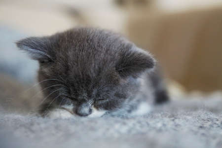 Adorable tiny kitten sleeping peacefully in hands of a person at home