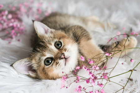 Cute Scottish Straight kitten and pink flowers on a white blanket.