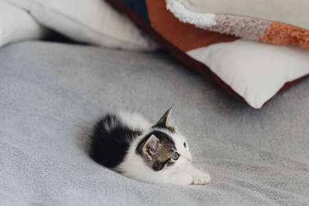 Cute little kitten sitting on soft bed. Portrait of adorable curious grey and white kitty relaxing on cozy blanket in bedroom. Adoption concept
