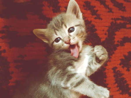 Cute little kitten of grey color with black stripes and spots, vintage background.