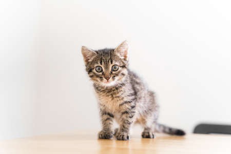 Close up of domestic small tabby kitten with big eyes. Curious cat lifestyle shot. Adorable cozy feline friend. Animal portrait with big eyes.