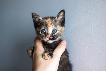 A individual is gently holding a beautiful calico kitten securely in their hand, showing the kittens delightful features and colors