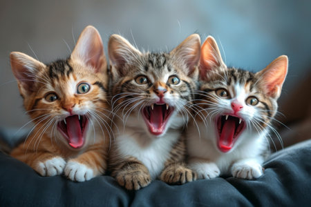 Three Playful Cats With Mouths Wide Open, Capturing Humorous Moment