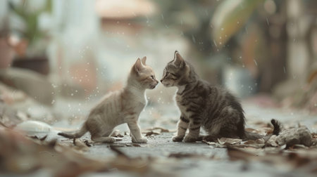 Two kittens face each other on a rainy day, looking at one another with curiosity.