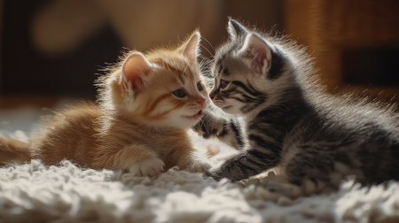 Two adorable kittens, one orange and one gray, playfully engage with each other on a soft rug, basking in the warm sun, showcasing their delightful friendship.