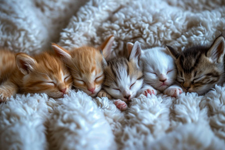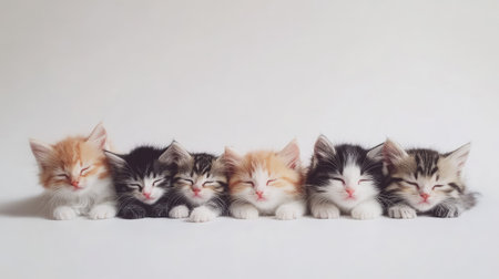 A charming image featuring a litter of colorful kittens peacefully lying in a row. Each adorable cat displays unique fur patterns and a tranquil expression, perfect for evoking warmth and happiness.