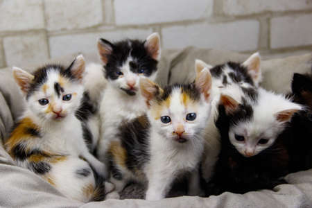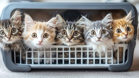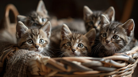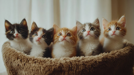 Five adorable multicolored kittens sit together in a cozy basket, displaying their playful and curious nature. Their expressive eyes and soft fur create a heartwarming scene.