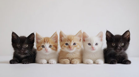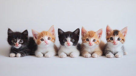 A charming image featuring five adorable kittens with varying fur patterns, showcasing their playful personalities and innocence in a soft studio setting. Perfect for animal lovers.