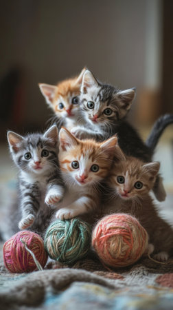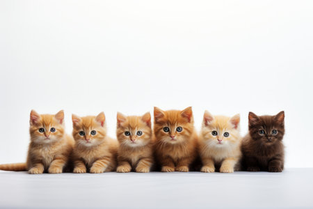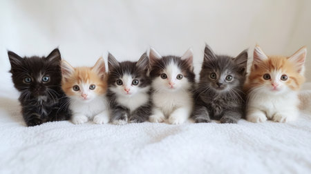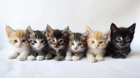 This charming image features a group of six adorable kittens in various colors, showcasing their playful and innocent nature. Perfect for pet-related themes.