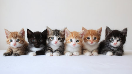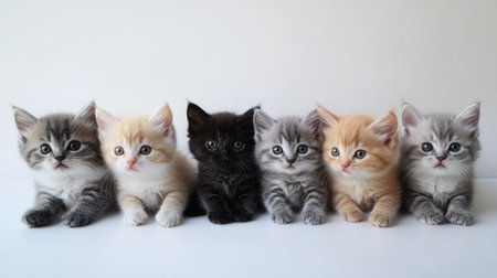 Six adorable kittens of different colors sit in a neat line, displaying their playful personalities and fluffy fur against a plain white background.