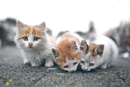 Three Kittens in the street, Horizontal image with selective focus.