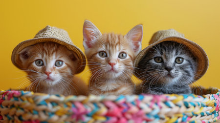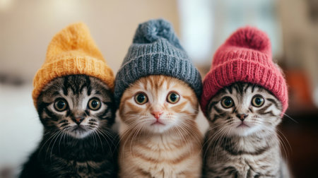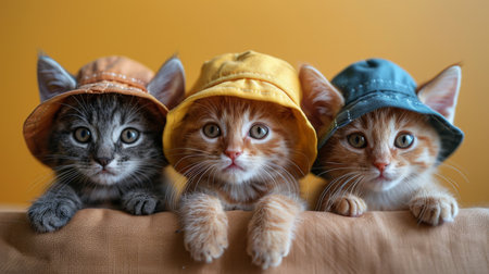 Three cats in hats of different colors on a beige background.