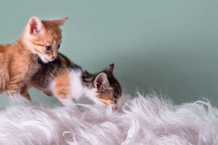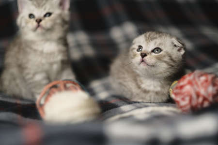 Curious kittens. Little cats at home playing on fur blancket. Small pets.