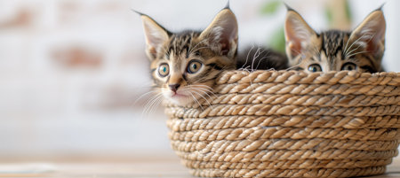 Two adorable kittens curiously peering out from a cozy woven basket indoors. The image has a bright and light ambiance, with a warm and inviting feel.