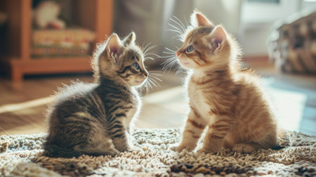 Two kittens are sitting on a rug, looking at each other. Scene is playful and curious