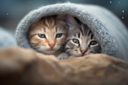 Two cute little kittens under a warm blanket. Selective focus.