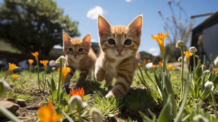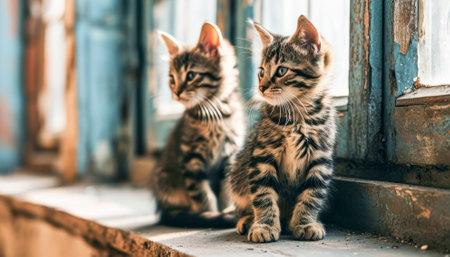 Two small kittens sitting on top of a cement ledge. Generative AI image.