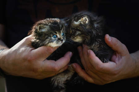 Close up male hands holding two gray kittens, blue eyes, dark background, horizontal orientation