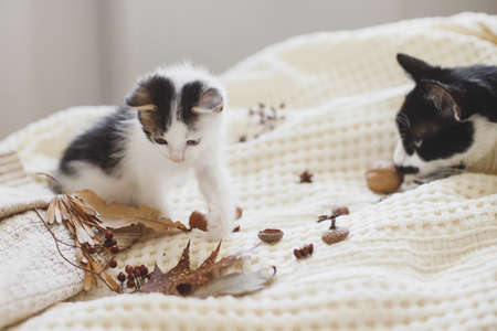 Adorable kitten playing with autumn leaves and acorns on soft blanket. Autumn cozy mood. Cute white and grey kitty playing with fall decorations on bed in room