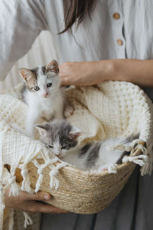 Woman in rustic dress holding basket with cute little kittens. Adorable grey and white kitties napping on blanket in basket. Adoption concept. Sweet lovely atmospheric moment
