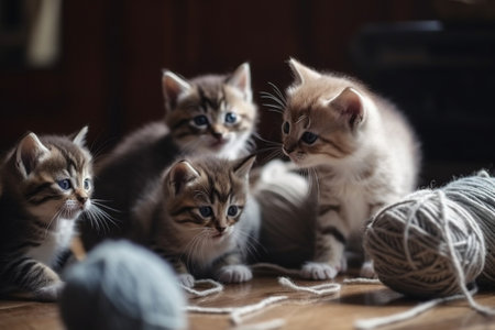 Kittens meowing and playing with a ball of yarn in a cozy house (generative AI)
