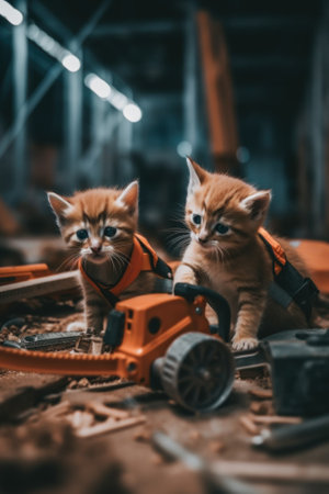 Two small kittens sitting next to a chainsaw. Generative AI image.