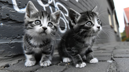 Two kittens are sitting on a brick wall next to graffiti, AI