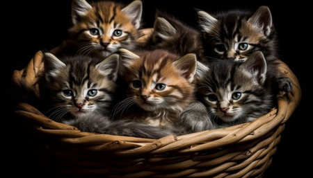 Fluffy striped kitten sitting in nature basket generated by artificial intelligence
