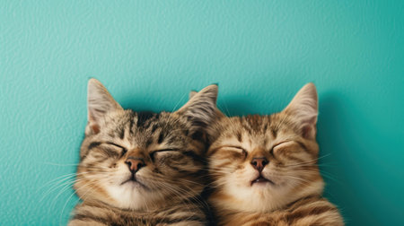 Adorable illustration of two content cats with their eyes shut, resting peacefully on a calming blue background, ideal for any use.