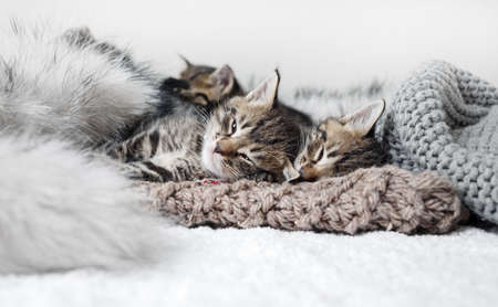 Two Newborn kittens sleeping under wool blanket