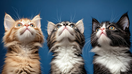Three fluffy kittens gaze upward, their playful curiosity evident. Their expressive faces and vibrant fur contrast beautifully against the serene blue background, capturing their youthful spirit.