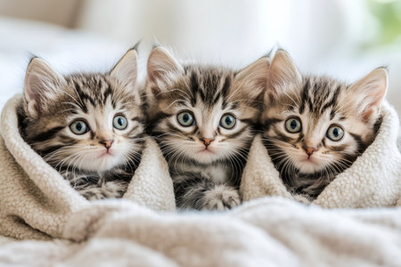Three adorable kittens wearing stylish hoodies sit closely together on a bed, looking curious and playful.