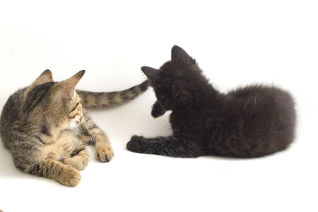 Beautiful domestic small brown gray cat and black cat playing isolated on a white background