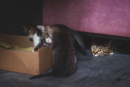 Abandoned Cat with kittens. kittens Under the maternity protection. Animal protection. Homeless animals.Low key.