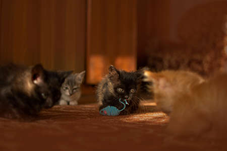 Homeless animals. abandoned kittens, cute kittens are playing, looking at the camera. Animal welfare in a homeless shelter. Low key, toned photo.