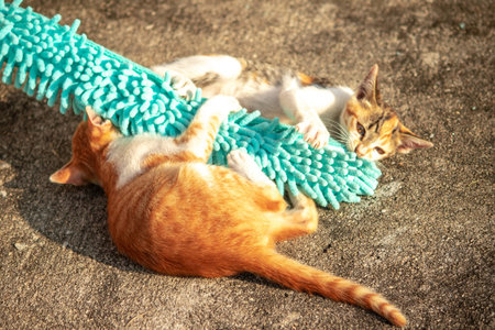 Frisky orange kitten playing with his caring mother cat. Funny ginger kitty