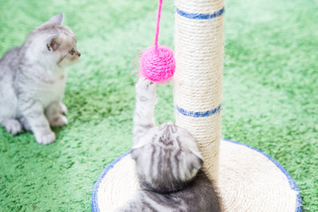 Two cute kittens playing a toy on a cream fluffy fur blanket