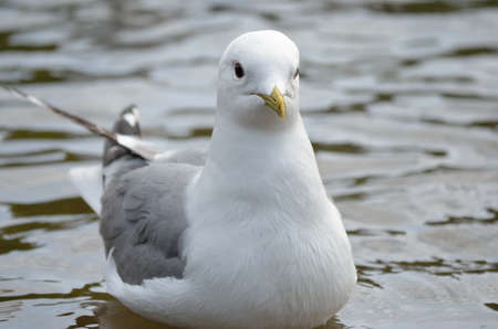 A seagull is standing on the water. The water is dark blue. The seagull is dirty