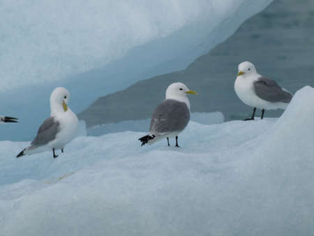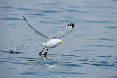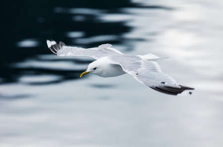 Kittiwakes (Rissa tridactyla) are one of the few bird species that fly to the North pole in summer. Flying adult bird over multi-year ice of 88 degrees North longitude