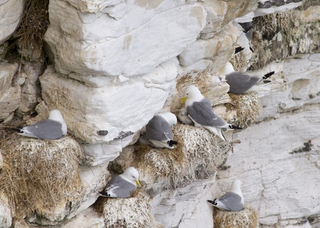 Kittiwake ( Rissa tridactyla ) nesting on a cliff edge