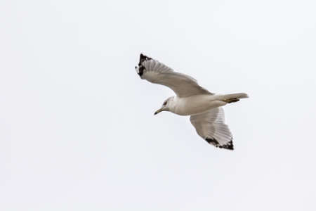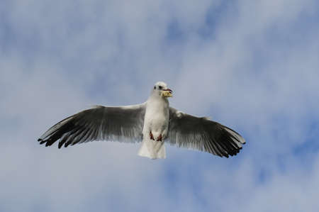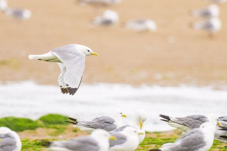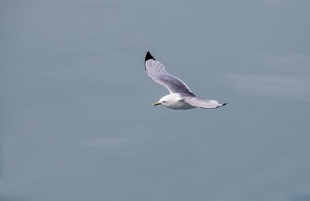 A Black legged Kittiwake in flight on a beach in northern France, cloudy day in summer