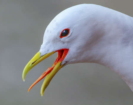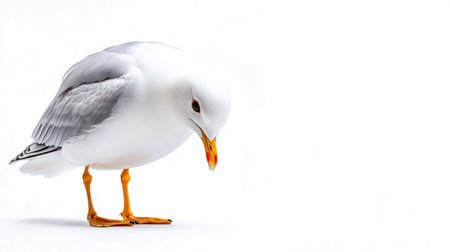 A close-up shot of a seagull, showcasing its features and posture against a white background.
