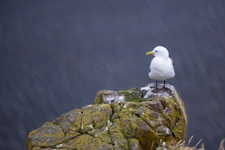 Black-legged kittiwake bird on nesting cliffside in summer, Iceland