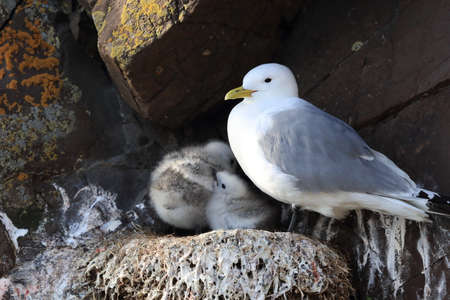 Black-legged Kittiwake juvenile on a nest in a cliff of Iceland (Arnarstapi)