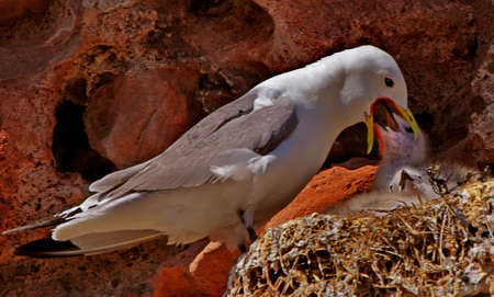Black-Legged Kittiwake (Rissa tridactyla) adult feeding a chick on the nest, Iceland, Polar Regions