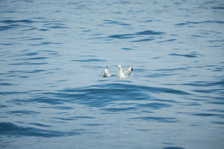 Animal in beautiful nature landscape for background, Closeup side view seagull bird flying happily on the blue sea in sunset, Bangpu Recreation Center famous tourist attraction, Samut Prakan, Thailand