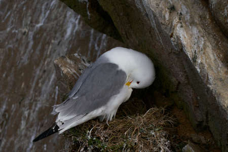 Kittiwake (Rissa tridactyla) preening on a cliff on Great Saltee Island in Ireland.