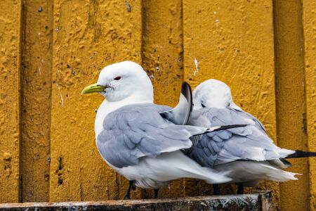 Two seagulls on raditional yellow wooden house, rorbuer in the small fishing village of Nusfjord, Lofoten islands, Norway.