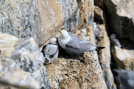 black-legged kittiwake birds on nesting cliffside in summer, sto vesteraalen