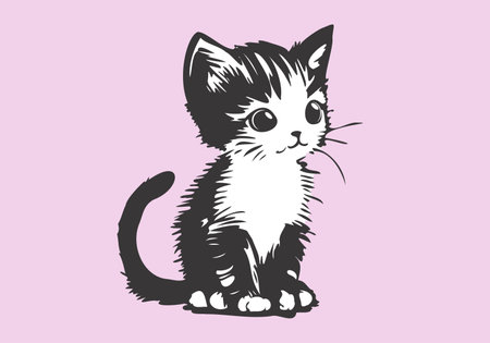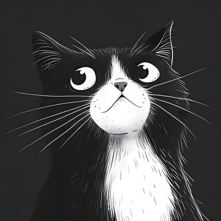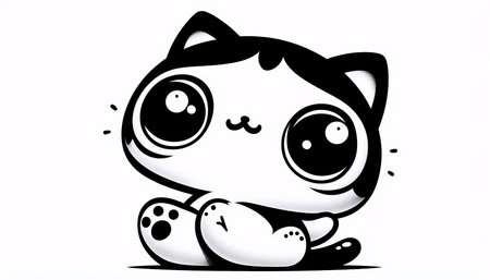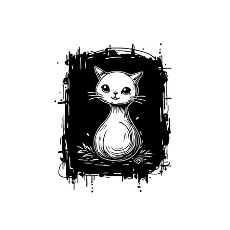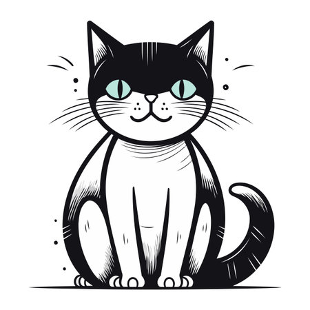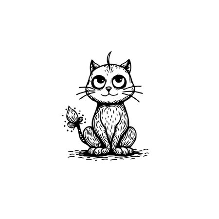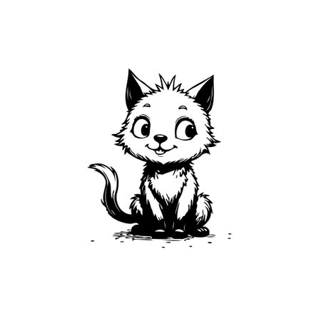 A charming cartoon cat illustration, rendered in monochrome with bold outlines and detailed fur texture. Ideal for children's books, educational materials, or playful graphic designs. This adorable